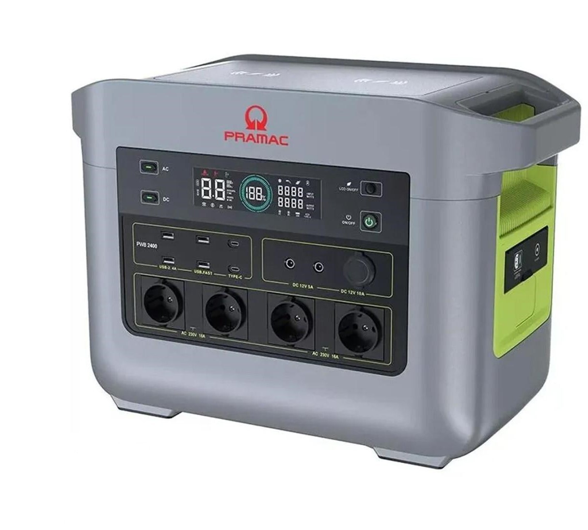 Powerstation PWB2400 fra Italienske Pramac. PWB er et universelt batterilagringssystem, der er ideelt til en lang række applikationer og leverer pålidelig strøm på den mest omkostningseffektive og miljøvenlige måde. Energi som er opbevaret i enheden omdannes elektronisk til vekselstrøm (AC). Strøm kan opbevares fra tilslutning til elnettet, fra en generator eller solcelleanlæg for at sikre den mest effektive, og laveste miljøpåvirkning. Realtidsmonitorering tilbydes via det indbyggede display for at sikre et effektiv brug.